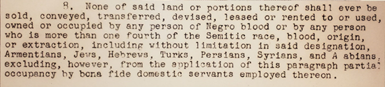 (This deed restriction or racial covenant governed a home in Johnson County’s Leawood Estates subdivision, built in 1954. The language in this restriction is typical, and the racial exclusion is explicit.)