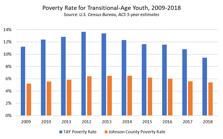 Since 2017, UCS has led the Transitional-Age Youth (TAY) Planning Project, which was launched in response to poverty trends in Johnson County indicating that the poverty rate for residents age 18-24 is almost double the countywide average. The TAY Planning Project supports implementation of a plan that coordinates best practices, protocols, and evaluation measures to ensure responsive and adequate delivery of services and supports for at-risk transitional-age youth.