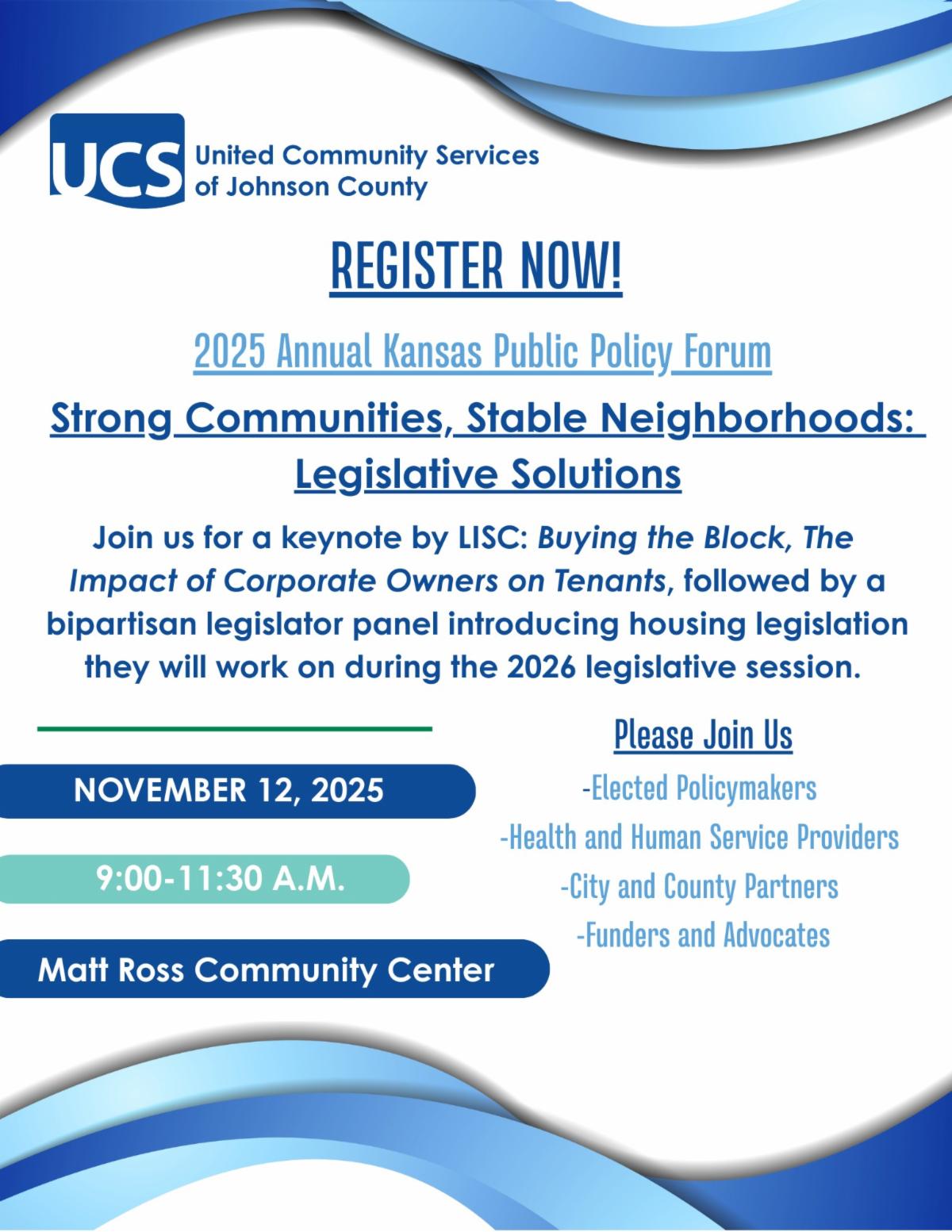 Join us for the 2025 Kansas Public Policy Forum: Strong Communities, Stable Neighborhoods: Legislative Solutions on November 12th at the Matt Ross Community Center.